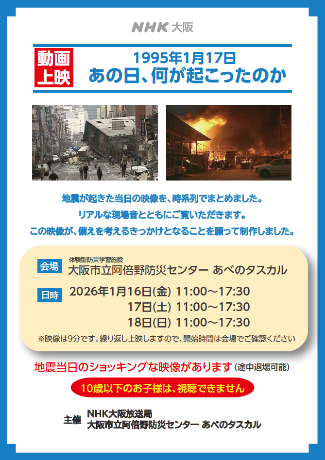 1月17日(土)は阪神淡路大震災の発生した日に伴いNHK大阪放送局作成の「1995年1月17日 あの日、何が起こったのか」をNHK職員による解説を交え上映します。